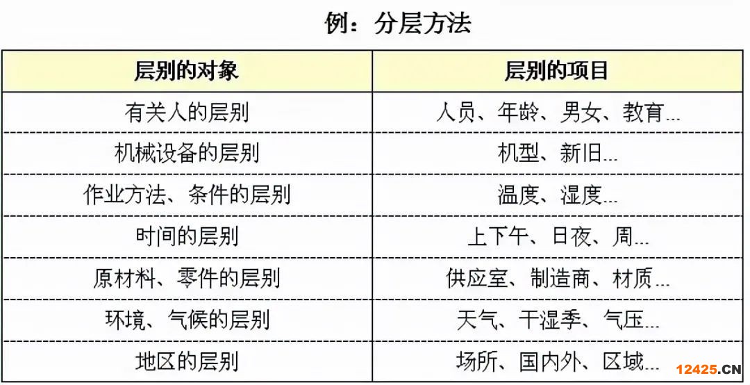 測(cè)定值是依據(jù)所取得之特征(例如制品種類(lèi)、機(jī)械裝置、工具或原料、材料、零件、作業(yè)種類(lèi)等),分成兩個(gè)以上不同的集團(tuán)。假如有任何因作業(yè)員、機(jī)械或原料的不同而影響到成品品質(zhì)時(shí),我們即可將測(cè)定值按其層次之不同分別整理,使其更容易了解,而在獲得有益的情報(bào)時(shí)能夠派上用場(chǎng)。
