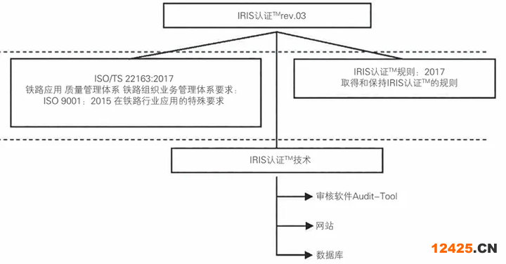IRIS協(xié)會標(biāo)準(zhǔn)以航空航天(AS 9100)和汽車行業(yè)(TS16949)等類似的質(zhì)量標(biāo)準(zhǔn)為模型,在ISO9001的基礎(chǔ)上,針對鐵路行業(yè)特點(diǎn),增加鐵路產(chǎn)品在安全性、可靠性及質(zhì)量上的行業(yè)特殊要求,如RAMS/LCC、項(xiàng)目管理、成本管理、投標(biāo)管理、績效管理等內(nèi)容,集中體現(xiàn)了以產(chǎn)品全生命周期為核心的管理思想。IRIS認(rèn)證是基于IRIS協(xié)會標(biāo)準(zhǔn)建立的鐵路行業(yè)供應(yīng)商質(zhì)量評估體系,由標(biāo)準(zhǔn)要求、認(rèn)證規(guī)則及輔助工具組成,以基于ISO/TS22163的IRIS認(rèn)證為例,其組成見圖1.