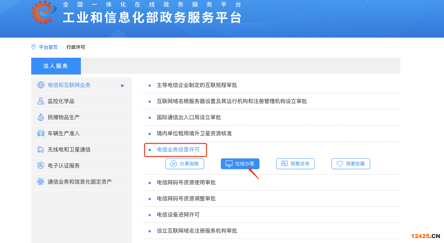 2、點(diǎn)擊首頁(yè)的行政許可——選電信業(yè)務(wù)經(jīng)營(yíng)許可,點(diǎn)擊在線辦理;