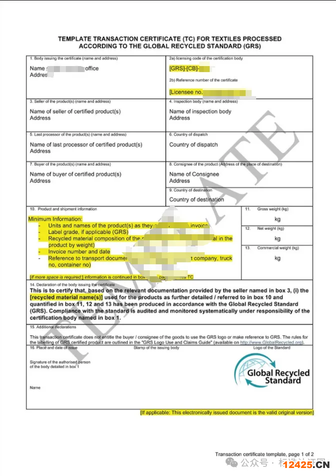 全球回收標(biāo)準(zhǔn)(GRS)是一項(xiàng)國(guó)際、自愿和全面的產(chǎn)品標(biāo)準(zhǔn),規(guī)定了回收內(nèi)容、產(chǎn)銷(xiāo)監(jiān)管鏈、社會(huì)責(zé)任和環(huán)境實(shí)踐以及化學(xué)品限制的第三方認(rèn)證要求。GRS的目標(biāo)是增加了產(chǎn)品中回收材料的使用,并減少/消除其生產(chǎn)所造成的危害。此標(biāo)準(zhǔn)適用于生產(chǎn)或銷(xiāo)售GRS產(chǎn)品的所有公司(單位)。包括加工、制造、包裝、卷標(biāo),銷(xiāo)售和使用的所有產(chǎn)品內(nèi)含量至少20%的再生材料。GRS認(rèn)證證體系可以適用于供應(yīng)鏈的所有單位:包括所有加工單位到最終買(mǎi)家端的商業(yè)至商業(yè)(B2B)交易。