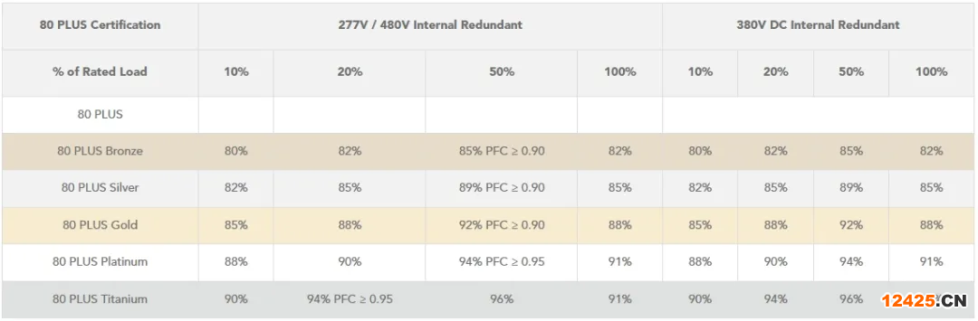 要了解青銅、白銀、黃金、鉑金和鈦金PSU評級,請查看以下80 PLUS認(rèn)證評級圖表: